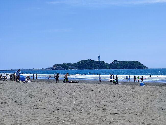 浜に出れば、その先には江の島もくっきり! ホットドッグを片手にボードウォークを歩いて江の島を目指すのも、鵠沼らしい贅沢な過ごし方です。